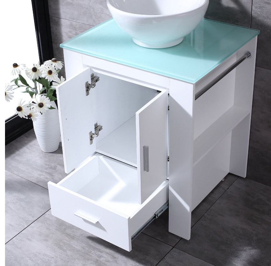 High quality multi-layer board can withstand threats of moisture and humidity than MDF and add beauty & elegance to any bathroom or vanity décor. Its unique white finish is complemented by a bright & clear countertop and designed for quick installation. It increases the overall texture, and is easier to maintain and clean than the ordinary ceramic countertop, and it will not to turn yellow after long-term use. One large storage space and five pull out drawers are designed to maximize storage options in your modern bathroom or powder room.