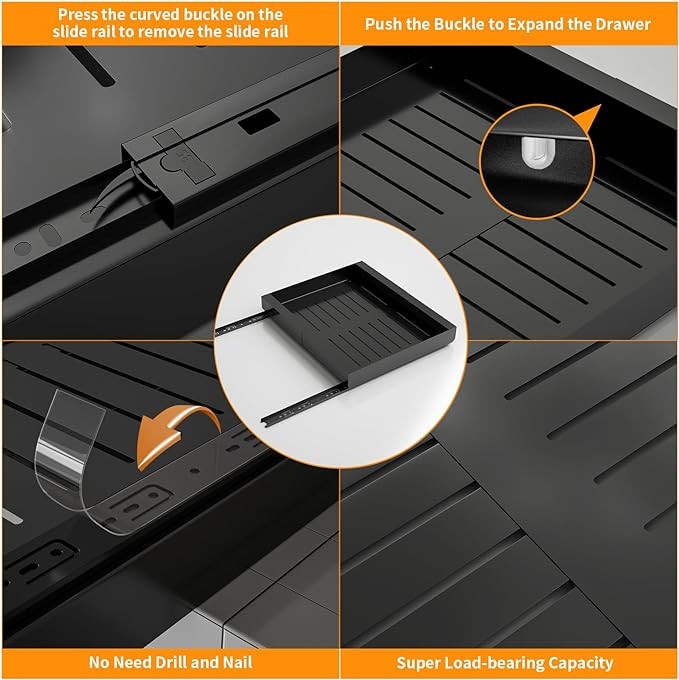 【Expandable Pull Out Drawers】: The pull out cabinet organizer features an expandable design that can be adjusted to fit different kitchen cabinets. Cabinet pull out organizer measures 17.1 inches deep * 2.4 inches high * 11.8 inches wide, and the width can be expanded to 19.7 inches. You can adjust the slide-out drawers at the base of your kitchen cabinets as needed.