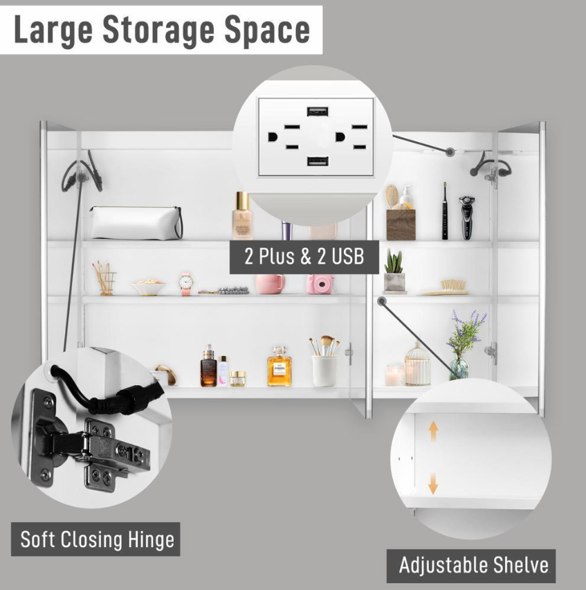 48x28in Bathroom LED Lighted Medicine Cabinet Wall-mounted with Charging Station