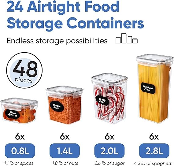 Kitchen Storage Containers - 24 BPA free food storage canisters included. These airtight food storage containers come with reusable chalkboard labels, a chalkboard marker, and a measuring spoon set.