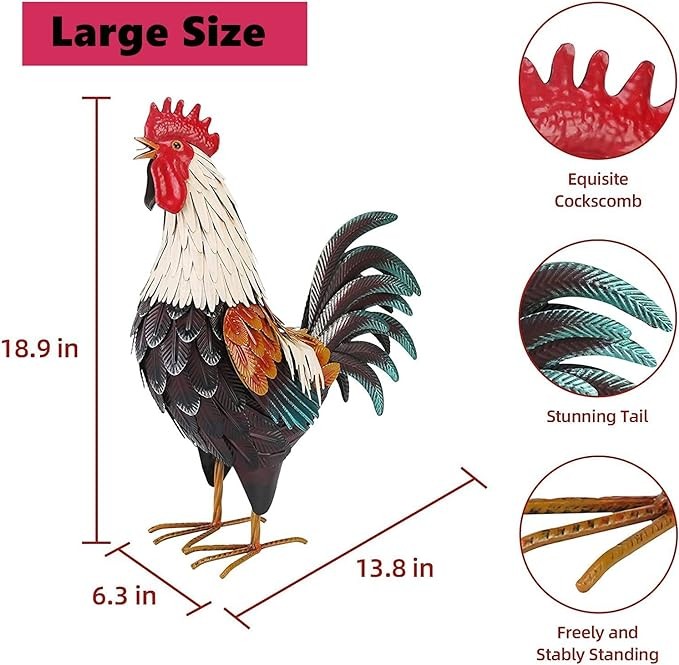• EASY TO ASSEMBLE .The rooster outdoor decor stands at 6.3"x13.8"x18.9".The Legs of the chicken sculpture knock-down for shipping, no tools required for assembly.