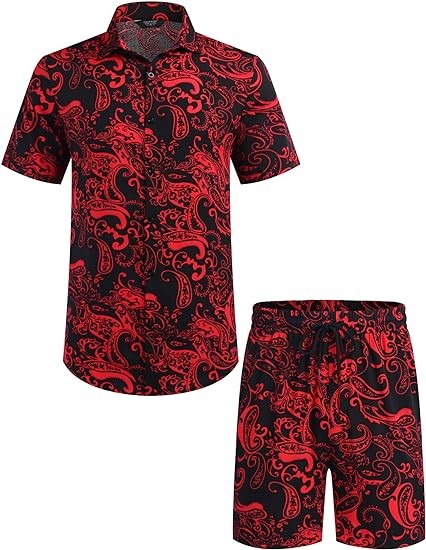 SUMMER CASUAL FLORAL SET--- Men's Hawaiian matching outfit loose fit, button-down short sleeve, spread collar; Beach Shorts with slanted side pockets and rear pockets, elastic waist drawstring. Simple and classic matching of shirts and shorts suits, save you the time of choosing to match.