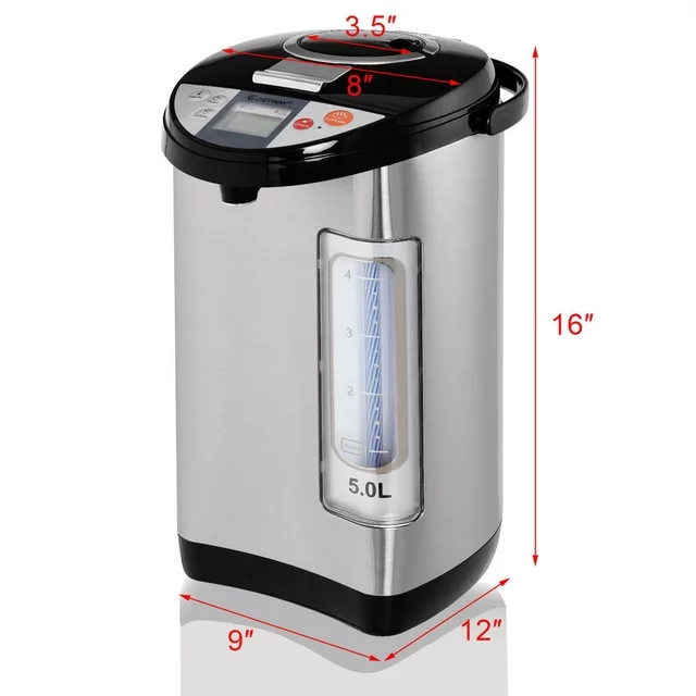 This electric thermo pot uses food grade 18/8 stainless steel to make the inner container so that you can rest assured of its safety. It features a LCD display with night light function for easy operation through which you can know the current water temperature and the display shows five stages of temperature(including 40, 50, 60, 85,98 degree C). This hot water dispenser is equipped with 3 different water dispensing methods:Air pump water outlet & Dispense water outlet & Cup water outlet. It's worth mentioning that the first one can be operated without power. It has a re-boil function to quickly bring water back to boiling. And the timer function allows water to be heated to the temperature desired at the perfect time when needed. The electric thermo pot will bring you a more comfortable and healthy life.