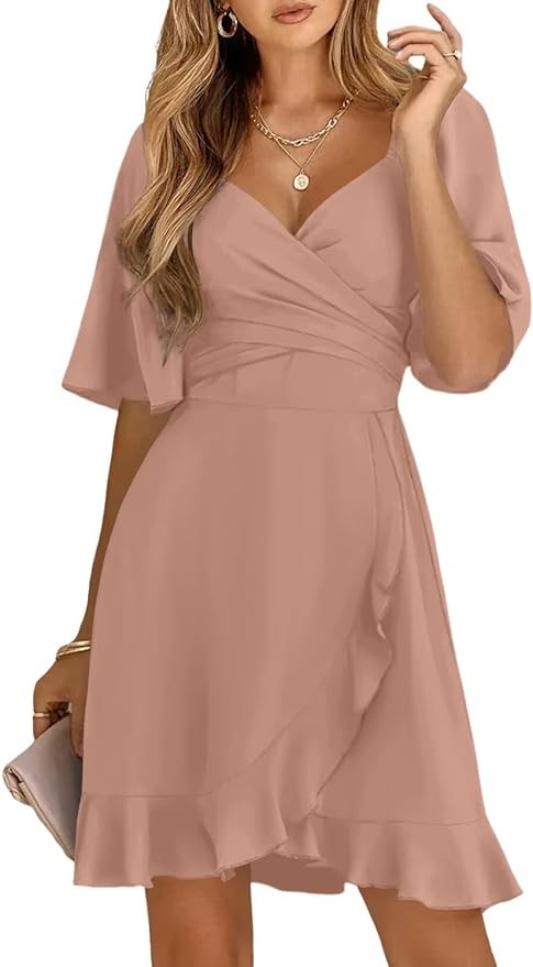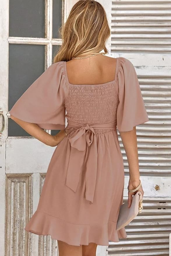 Dokotoo Women's 2024 Summer Dress Wrap V Neck Short Sleeve Smocked Elastic Waist Tiered Belted Ruffle Hem Mini Dresses