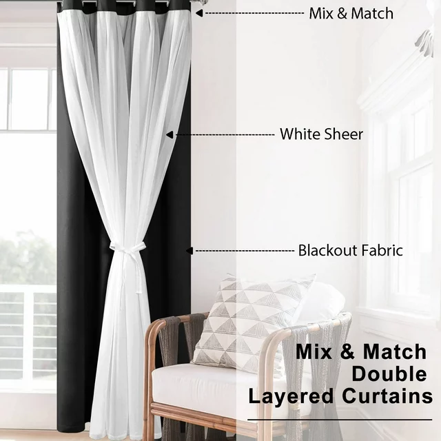 PREMIUM MATERIAL: Hiasan mix & match blackout curtains with white sheer overlay are crafted with high quality fabric. Great soft and durable curtains are idea for home decor. Each package includes 2 double-layered panels measuring 38"W by 84"L inch.Each panel has 8 silver Grommets (1.6" inner diameter). These light blocking curtains are in combined design, so it is easy to hang and slide on one curtain rod
