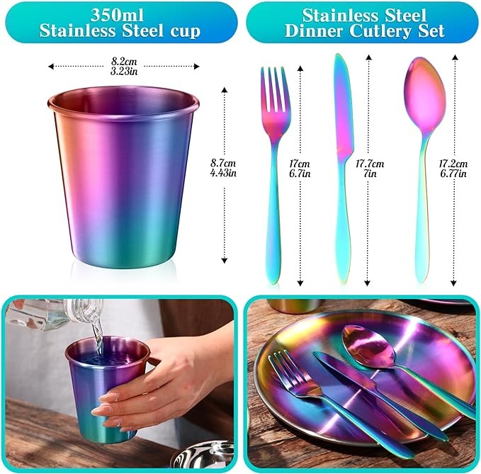 Tableware Set for 6: you will receive 36 pieces rainbow stainless steel dinnerware set include 6 dinner plates, 6 dinner bowls, 6 cups, 6 salad forks, 6 dinner knives and 6 dessert spoons, sufficient quantity suitable for camping picnic home kitchen and party service, and also apply to daily use for a family