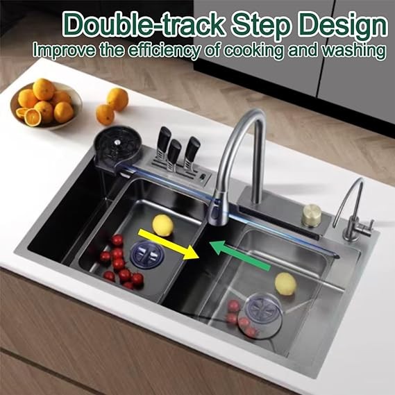 • ✔【High Quality Material】This waterfall kitchen sink is newly listed. It is made of high quality SUS304 grade stainless steel with excellent hardness and durability. The kitchen sink is treated with nano-coating, which is rust-resistant, durable and long-lasting. It wipes clean and is easy to maintain. It is very easy to clean and offers long-lasting performance you can trust.