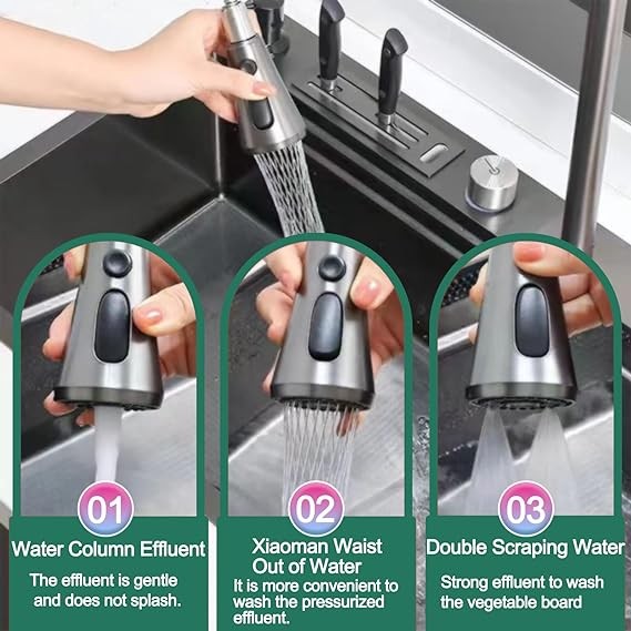 • ✔【360° Pull-out Faucet / Sink Waterfall Design】With the 360° pull-out faucet and its three spray modes, cleaning dishes and vegetables has never been easier. This faucet is perfect for a variety of usage scenarios in the kitchen. The innovative sink waterfall design is a game changer! It not only gives your kitchen a modern and innovative look but also makes it easier to clean vegetables and fruits.