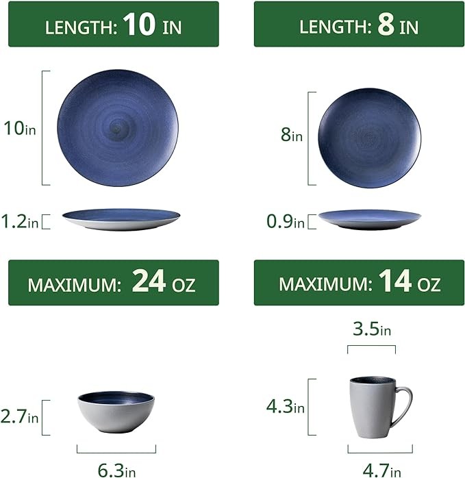 • PERFECT FOR GIFTING: Our dinnerware set is cool and trendy. Especially in a fashionable blue and gray. This 2-tone glazed dinnerware set is popular with young people. Perfect gift for housewarming, Thanksgiving, Christmas and joyous celebrations.