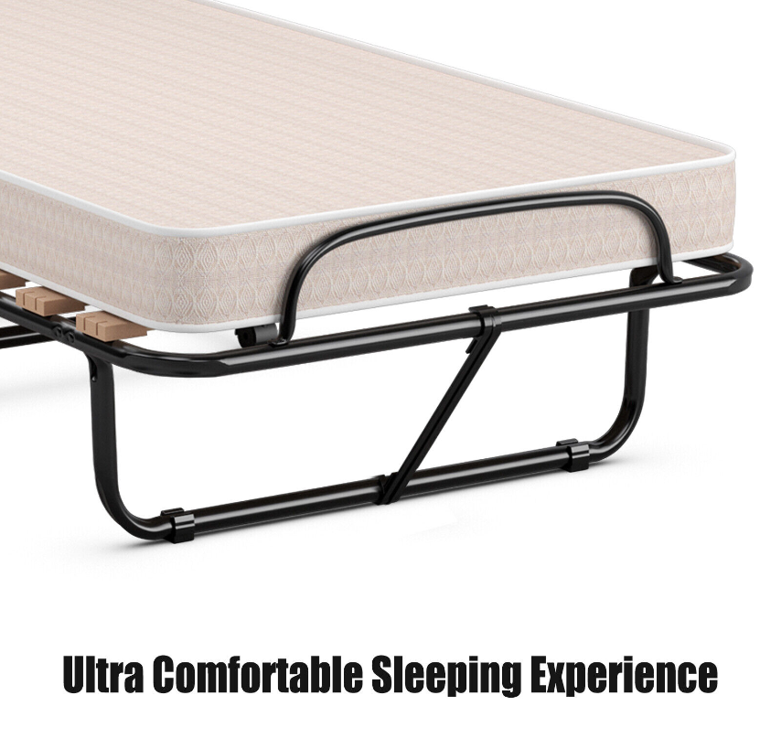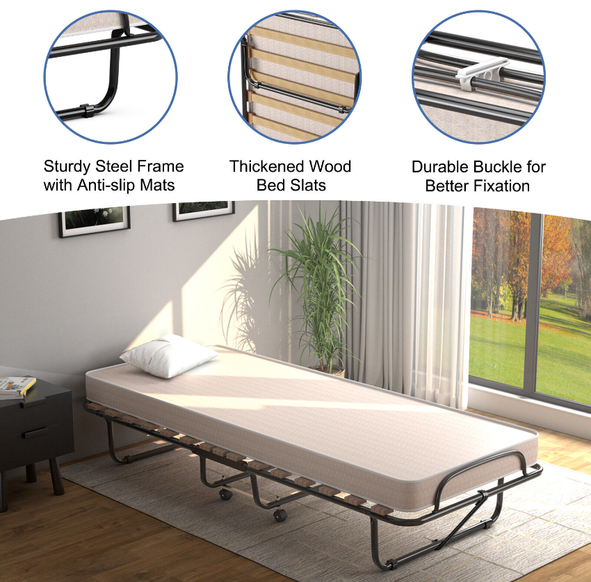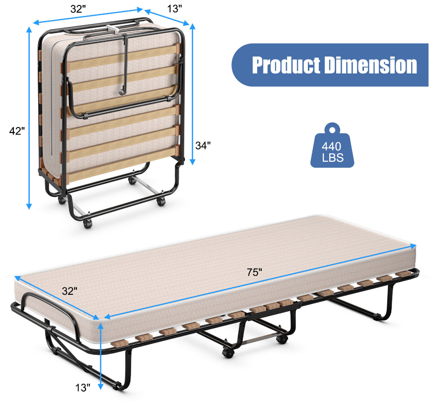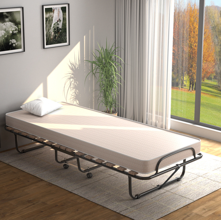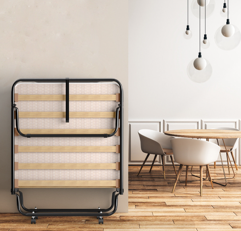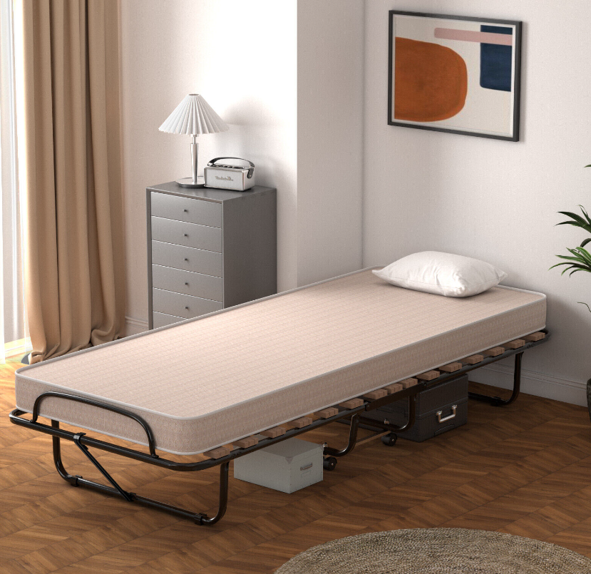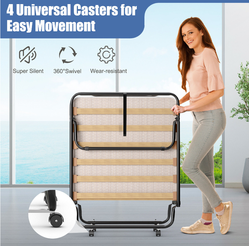 Description: Our folding beds provide you ultimate sleep experience! With high soft and high quality foam mattress, this folding bed gives you a cozy and comfortable feeling when you are lying. The study metal construction with dense slatted bar is strong enough to withstand maximum load-bearing capacity of 265 pounds. What's more, this bed is perfect for limited space due to its folding design. And the all-directional wheels allow you to move and store it anywhere. It can be placed in the living room, bedroom, office, study room and more places. Enjoy your leisure time with this upholstered bed!