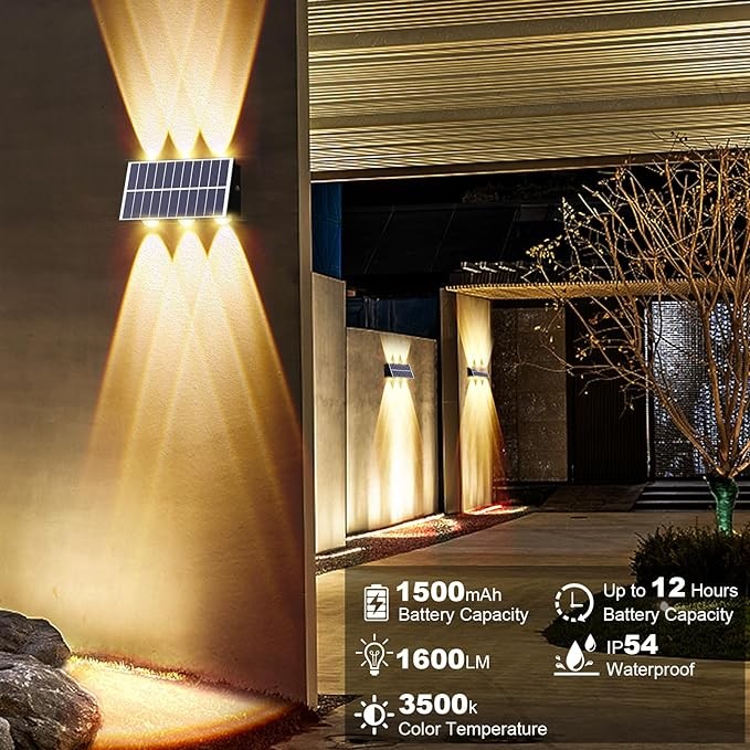 • 【Outdoor Solar Wall Light】4pack upgraded version of the high-brightness up and down solar wall light uses 6 high-quality SMD5050 LED beads and a convex mirror design, the solar wall light can provide you with a bright and romantic lighting environment, creating a relaxed and comfortable atmosphere. Unleash the beauty hidden in the darkness for your outdoor fence, wall, garden, patio, deck, steps, window, porch, balcony or wall.note: Please press and hold the button for 5 seconds to turn on the light in a dark environment or cover the solar panel.